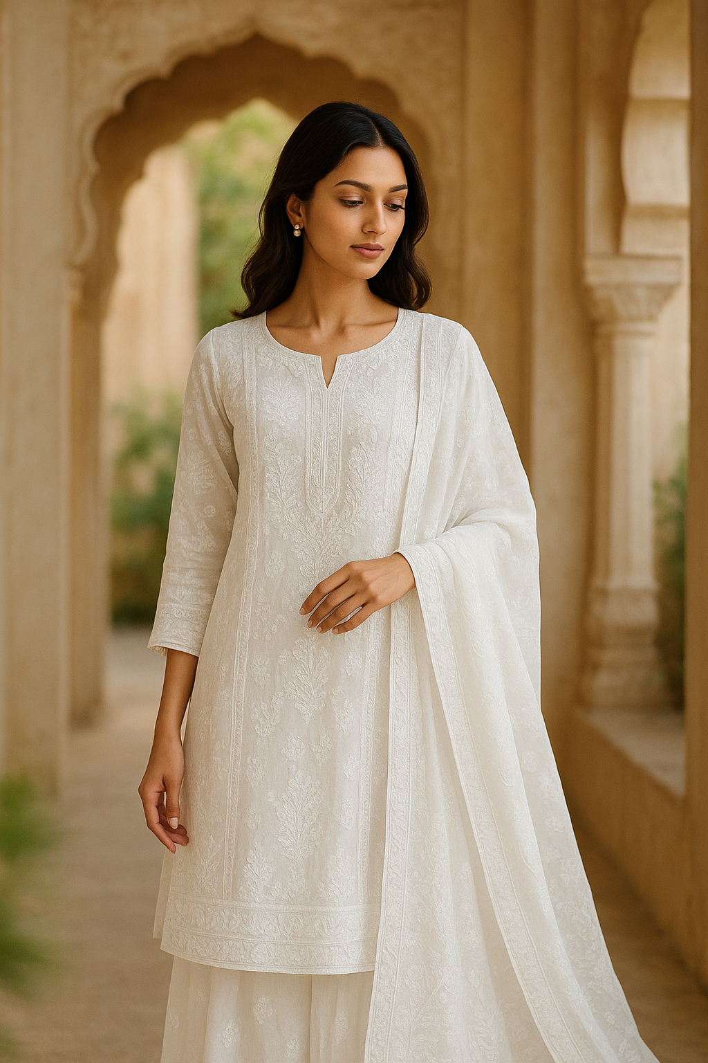 "Green Silk Chikankari Kurti with White Hand Embroidery | Lucknowi Ethnic Wear for Women"